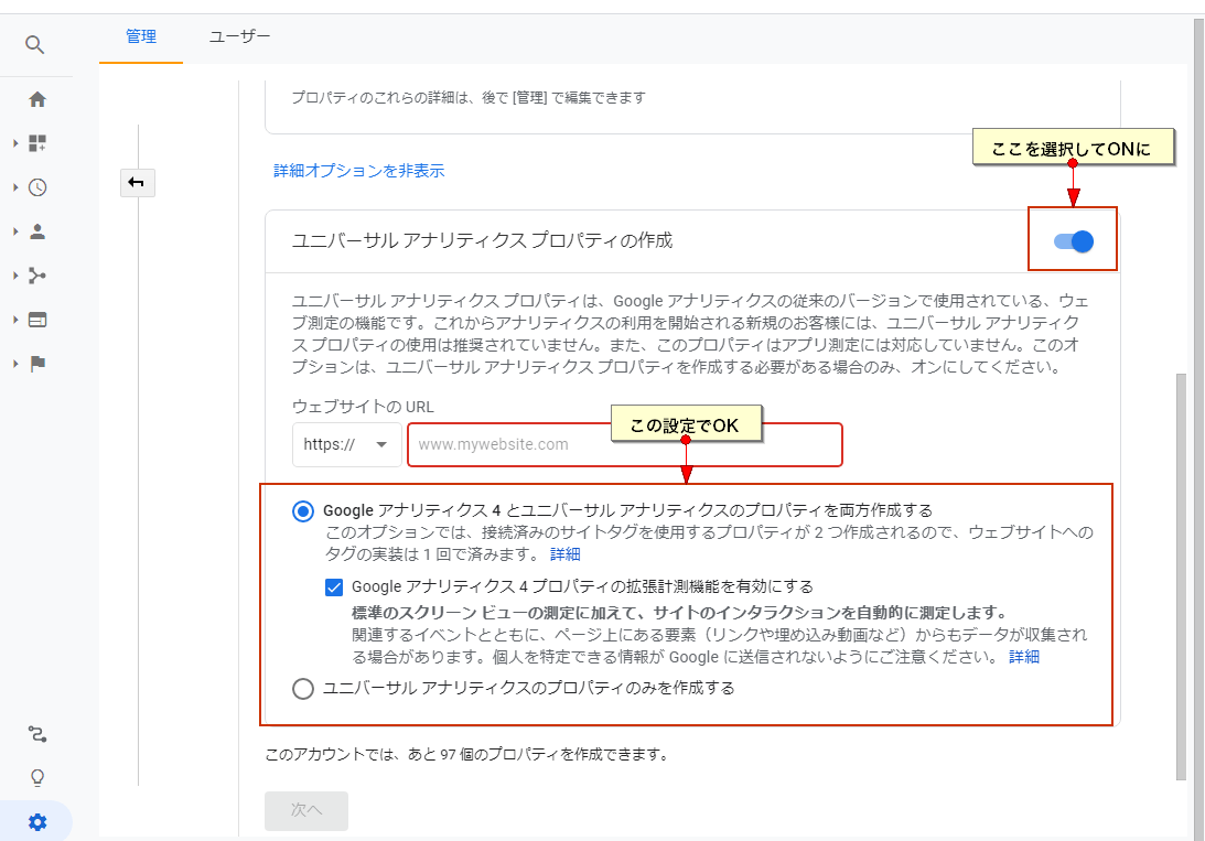 GA4のプロパティ初期設定画面で「詳細オプションを表示」の中にユニバーサルアナリティクスを設定する項目が隠されています。
