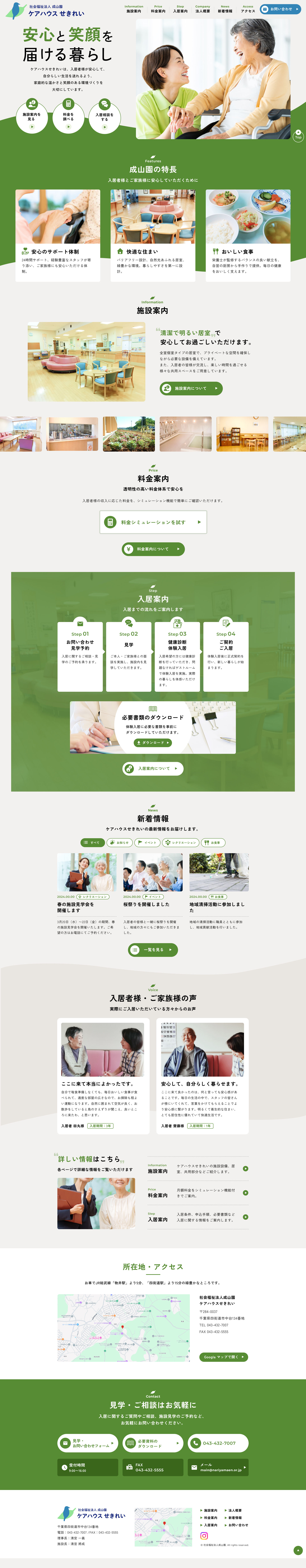 コーポレートサイトをリニューアルするにあたって、自然と調和する落ち着きのあるグリーンを基調とし、ゆとりのあるデザインにすることで、企業がもつ「安心感」「信頼性」を与えるような印象に刷新しました。また、施設内部の様子や日常の風景が伝わる写真を多く使用し、利用者やご家族が実際の生活イメージを持てるよう設計。視覚的な安心感を高めることで、問い合わせや見学につながる導線を強化しています。